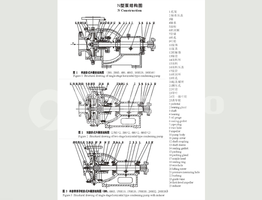 N型泵有卧式、单级或多级、悬臂式及带诱导轮等多种结构形式。主要由泵体、泵盖、叶轮、轴、轴套和支承部分构成。3N6、4N6、4N6A及100N130型泵为卧式悬臂单级冷凝泵;2.5N3×2、3N6×2、4N6×2型泵为卧式悬臂两级冷凝泵;6N6及150N110是卧式悬臂带诱导轮单级冷凝泵。轴承采用悬臂式托架装有两个滚动向心球轴承支承。可承受未被平衡的轴向力,采用稀油润滑。